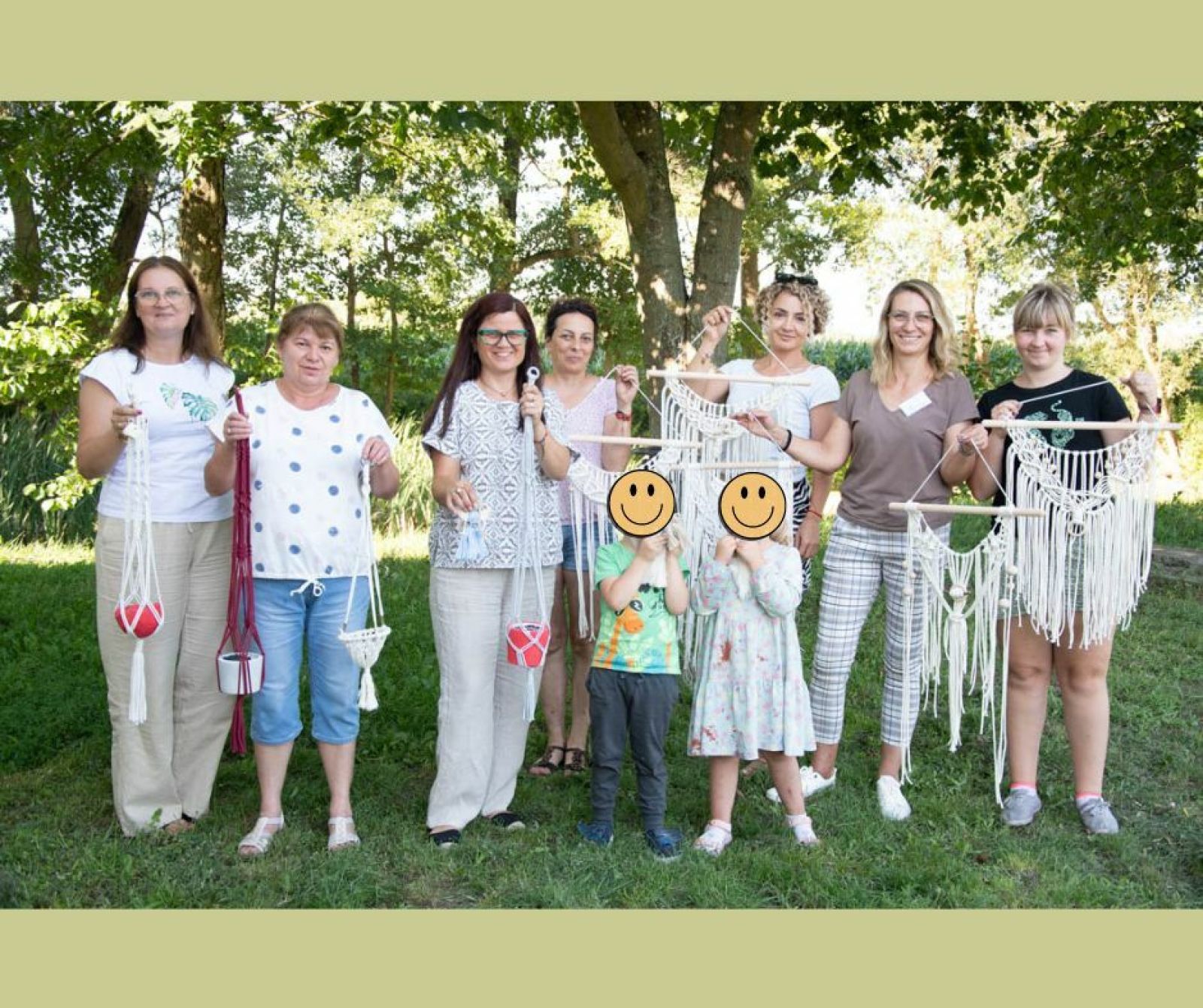 • Zbiorowe zdjęcie uczestników warsztatu makramy wraz z wykonanymi przez nich dziełami