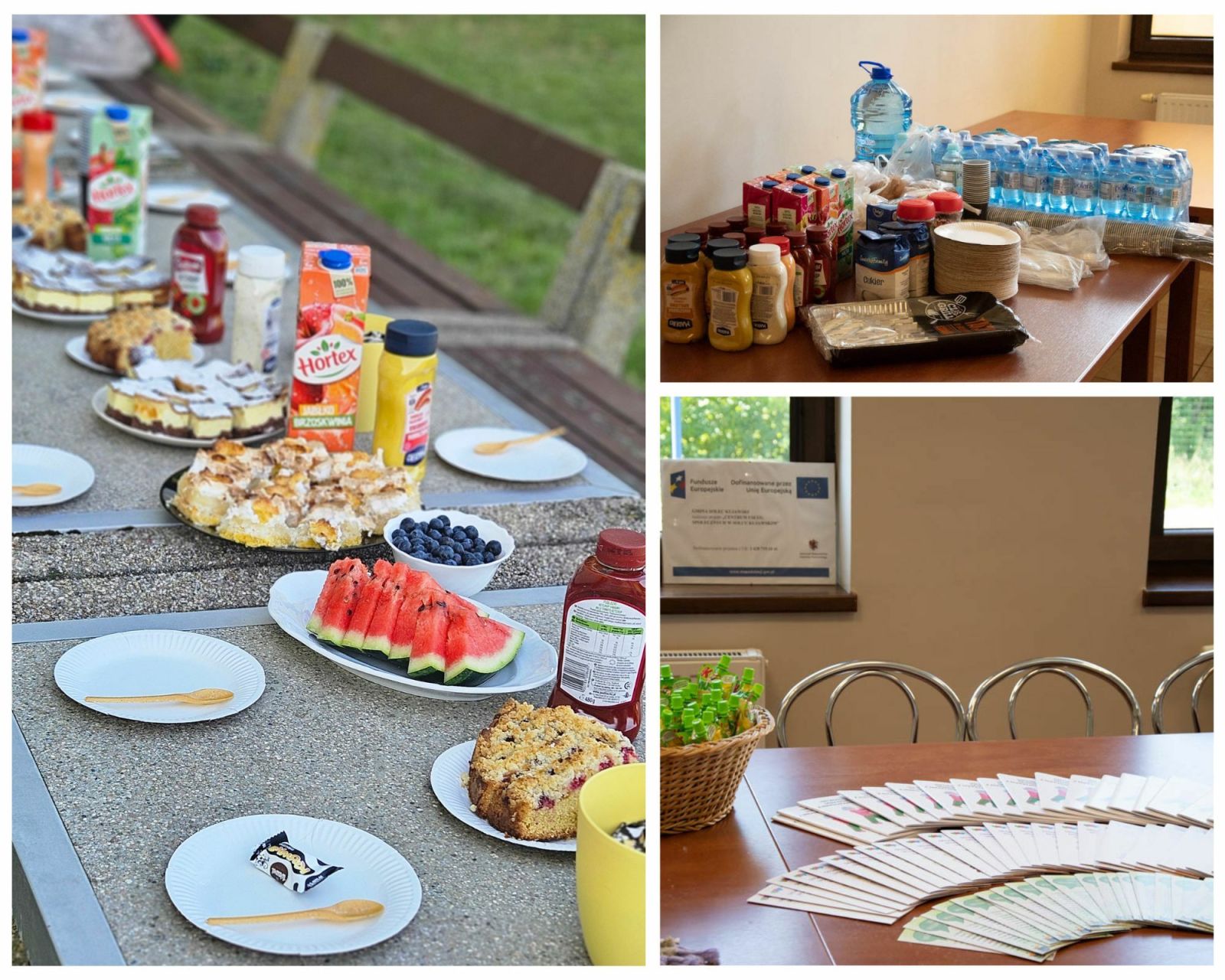 • Kolaż ze zdjęć ukazujący przygotowany poczęstunek oraz plakat promocyjny projektu wraz z ulotkami
