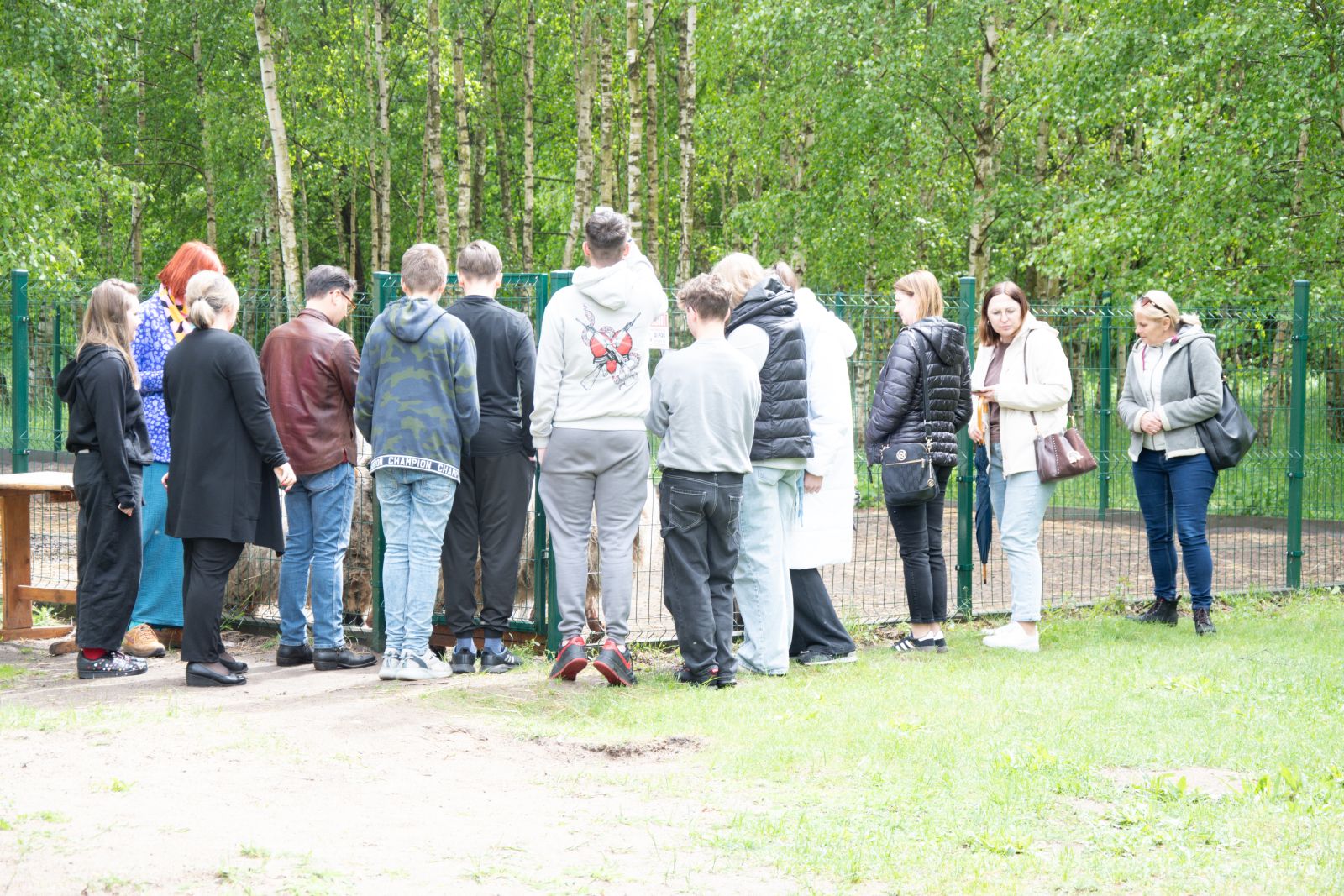 • Uczestnicy przy zagrodzie zwierząt wraz z Prezesem Fundacji Art House RR Panem Radosławem Osińskim